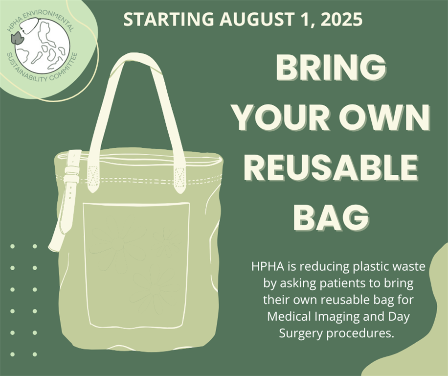 As part of our commitment to sustainability, we’re encouraging patients coming for Medical Imaging or Day Surgery appointments to bring their own reusable bags for their belongings.